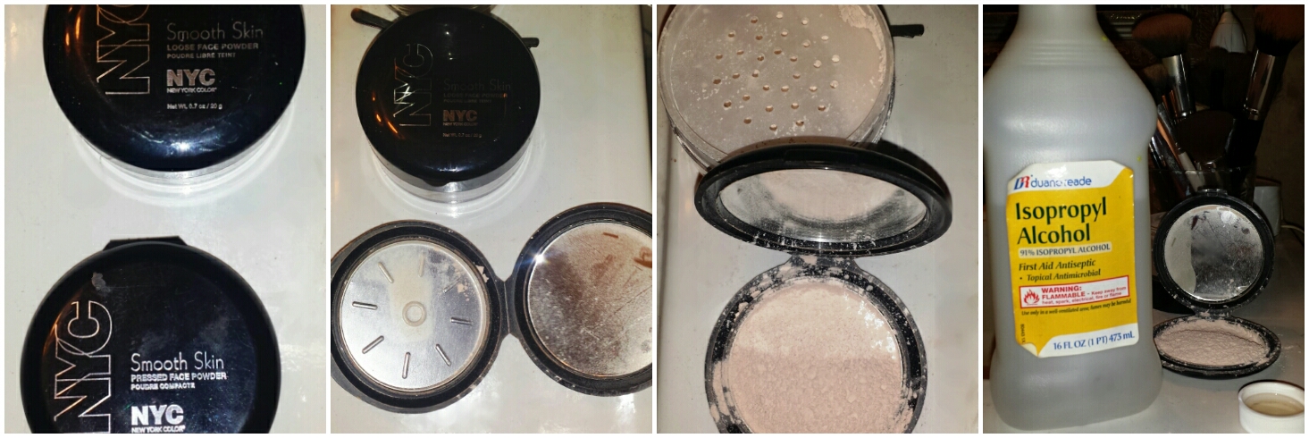 A while back, I posted about using rubbing alcohol to fix pressed powders, shadows, etc., that had been shattered in their palettes/compacts*. I decided to revisit this chemistry experiment when I completely ran out of my NYC Smooth Skin Pressed Face Powder in Translucent. This has got to be one of my all-time favorite drugstore setting/blotting powders; it’s widely available, sets and blots extremely well, and only costs about $2! You can’t go wrong at that price. I mean, seriously. On this particular day however, its awesomeness proved to be a double-edged sword because it was sold out at my beauty depot (i.e.: Duane Reade, my too conveniently located 24-hour drugstore and enabler)—I guess the word is out!